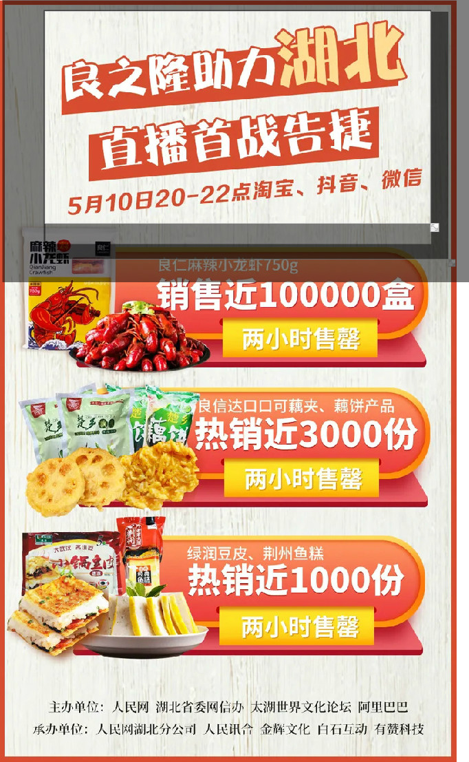 华体会注册大厅助力湖北重振,首战取得开门红!来自华体会注册大厅的良仁麻辣小龙虾销售近100000盒;良信达口口可藕夹、藕饼产品热销近3000份;绿润豆皮、荆州鱼糕热销近1000份