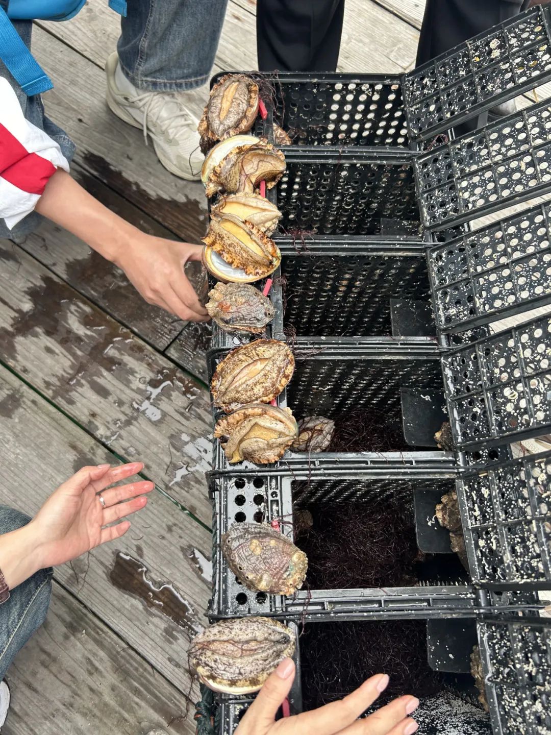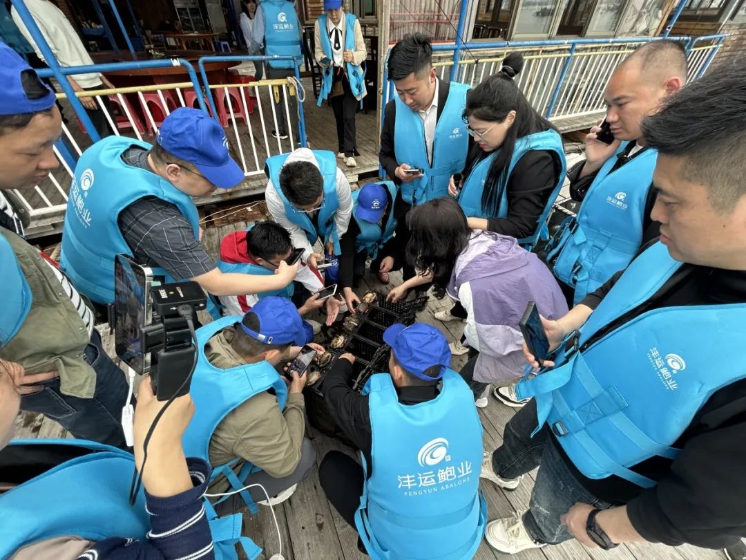 放眼望去,海洋牧场无边无际,工人们正在娴熟地往笼子里投喂鲜嫩的龙须菜和海带。在沣运鲍业活鲍负责人黄总细致的讲解及带领下,考察团成员们亲身来到了鲍鱼的海上养殖平台,目睹了鲍鱼宝宝的生长环境;学习了如何分辨鲍鱼公母、身体结构、养殖等小知识,并现场感受到了鲍鱼满满的活力。